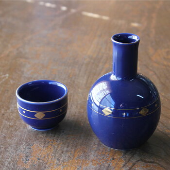 ルリ菱紋徳利とぐい呑みセット ルリ色に金のラインと菱紋がアクセントの小さな徳利とぐい呑みです。
