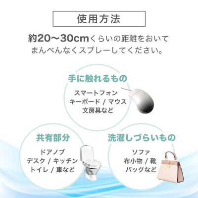 布製品やドアノブ、デスク、バッグ、文房具などよく手に触れるものや、掃除・洗濯がしにくいところに吹きかけられる便利なスプレー式。