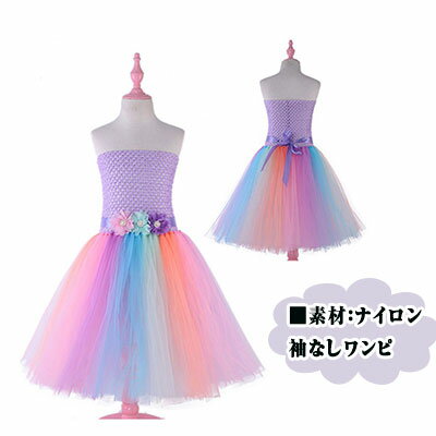 【2個以上50%OFFクーポン】ハロウイン 衣装 子供 女児 女の子 レインボー風淡いパステルカラーのハロウィンコスプレ衣装 ワンピース+頭飾りの2点セット 90 100 120 140 160 オフショルダー ふんわりスカート チュチュ チュールスカートワンピース